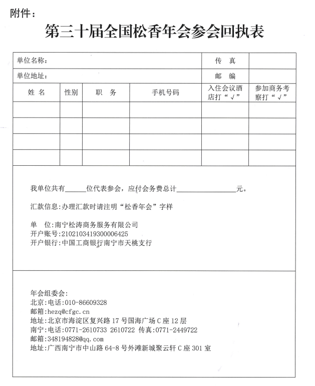 报名参加本届年会的企业请填写“第三十届全国松香年会”回执表(见附件),并于2025年11月15日前将参会回执表通过传真或电子邮件发送到本届年会组委会,并将相关会务款项汇至组委会账户。