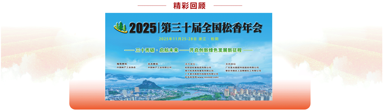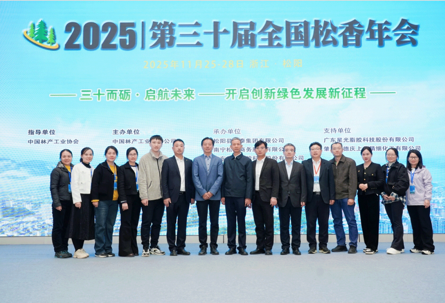 2025年11月25-28日,第三十届全国松香年会在浙江省松阳县隆重召开。本届年会的主题是“三十而砺启航未来一开启创新绿色发展新征程”,以本次会议为契机,回顾松香人矢志振兴产业的辉煌历程,站在新的起点,为松香产业的未来发展把舵定向。国家林草局发改司原副司长苏祖云,国家林草局发改司原副司长李玉印,原国家林业局科技发展中心主任黎云昆,中国林产工业有限公司副总经理、中国林产工业协会副会长王凡非,中共松阳县委书记梁海刚,中国林产工业协会副秘书长刘栋等领导及嘉宾莅临指导。会议由广东星光脂胶科技股份有限公司董事长、中国林产工业协会副会长宋力丰主持。 更多...>>>